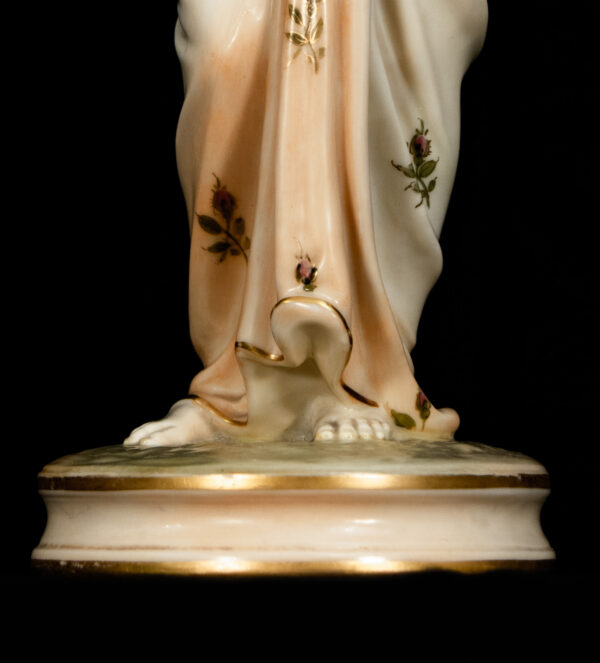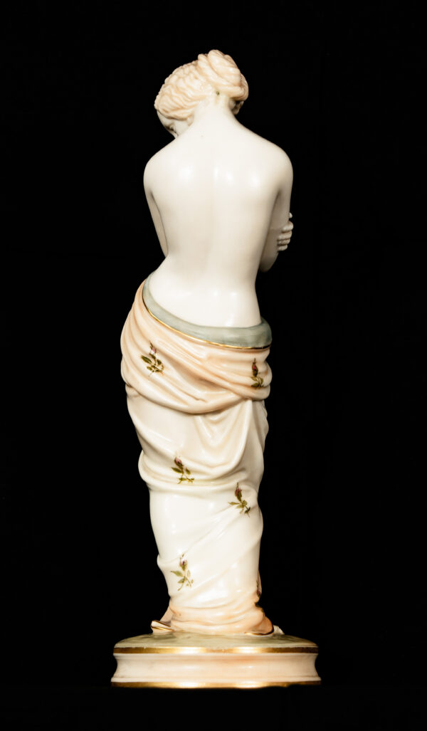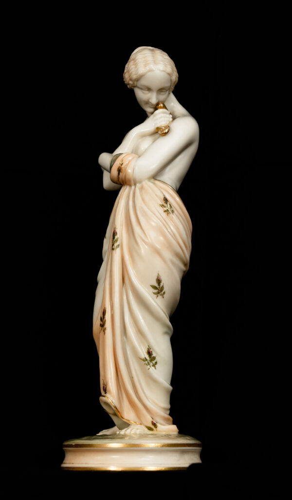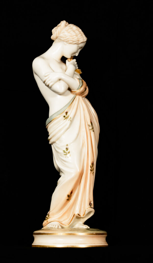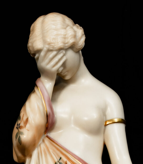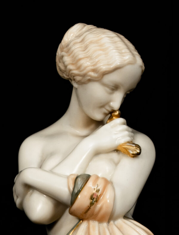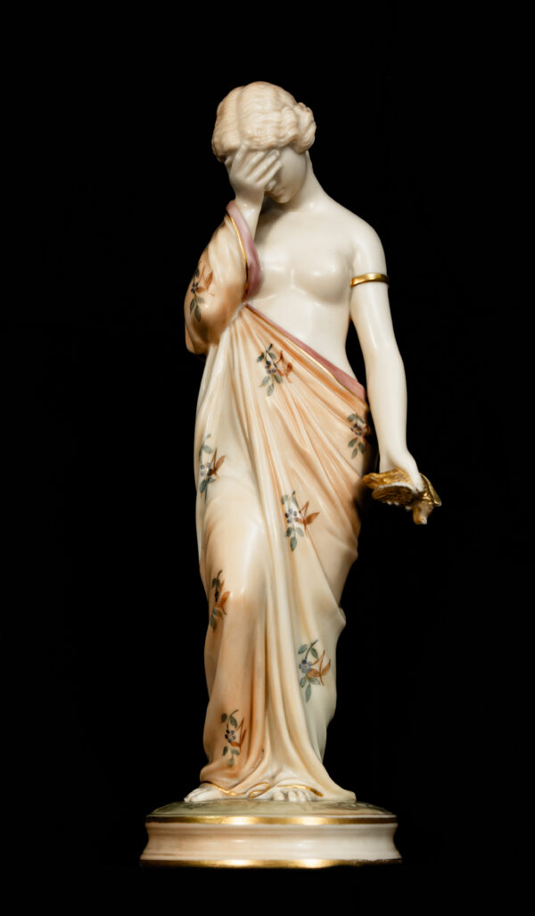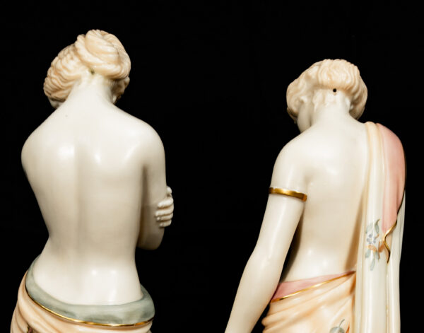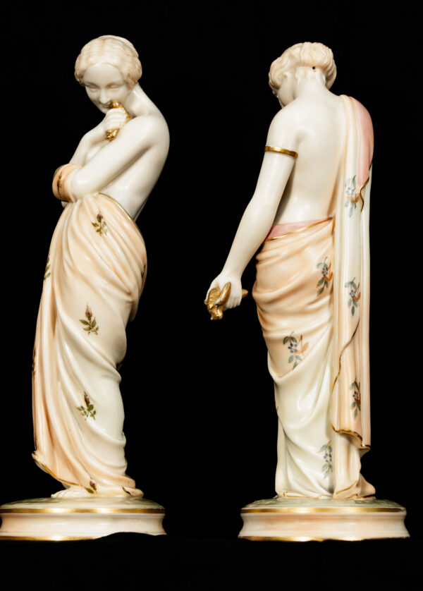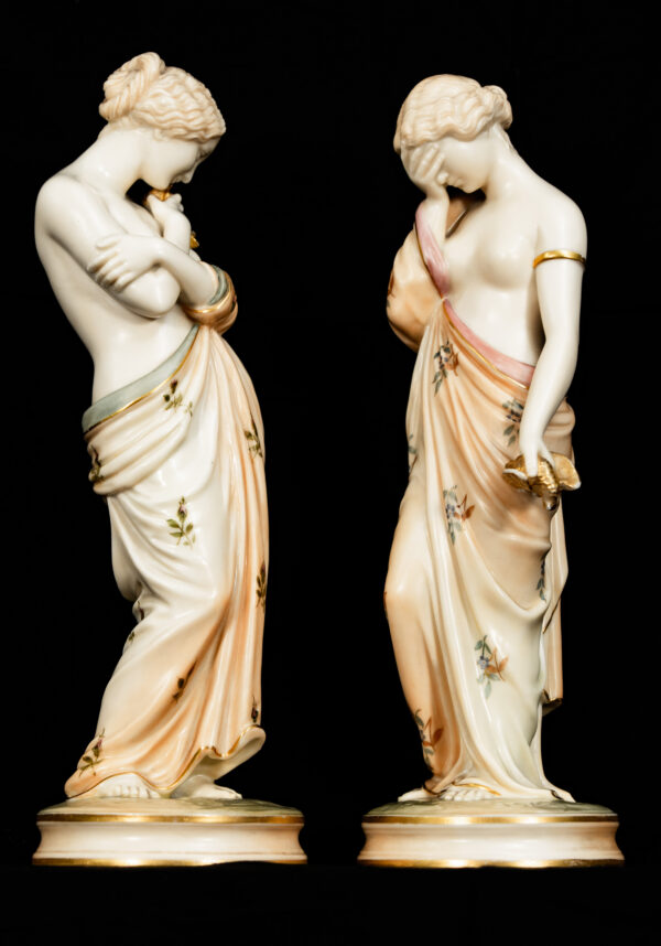 The quality of modelling, the fluidity of the drapery, and the refined hand-decoration are hallmarks of Royal Worcester’s finest figurative production. Standing on circular bases with gilded detailing, the figures display beautifully as a pair and reflect the firm’s mastery of classical themes and emotional storytelling.