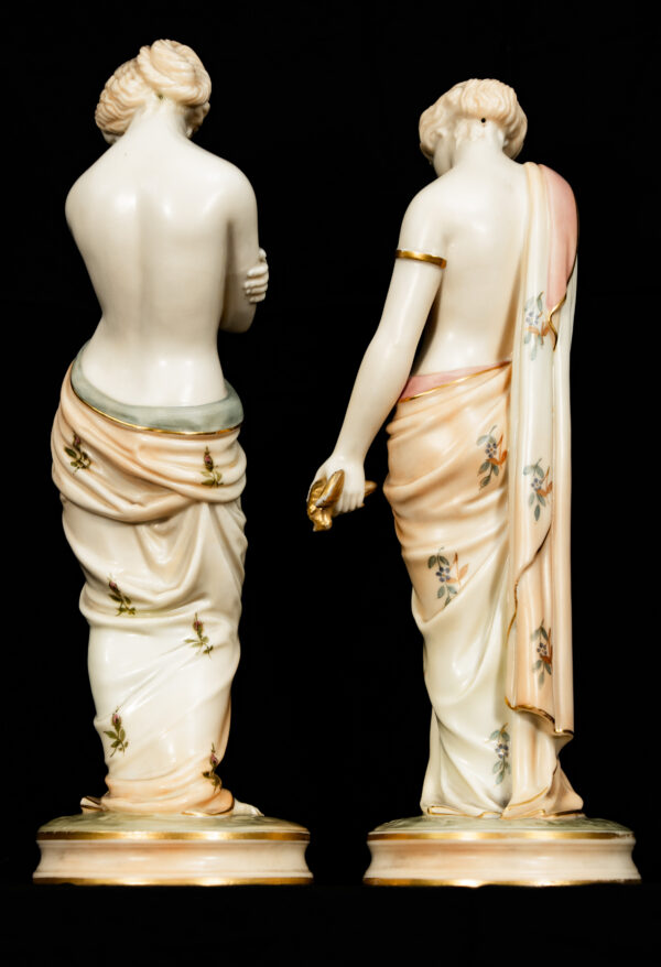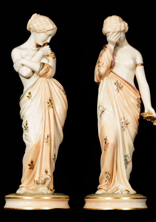 Highly sought after by collectors of English porcelain, Royal Worcester figurines, and allegorical art, this pair offers both decorative elegance and strong artistic significance. They make an outstanding centrepiece for a refined interior or a distinguished addition to a serious porcelain collection.