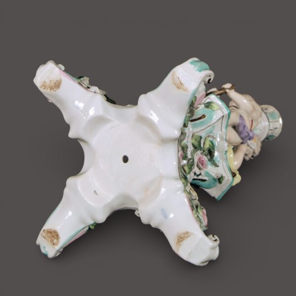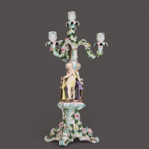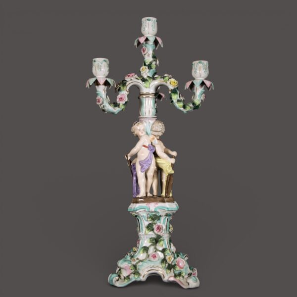 The candle branches are removable, allowing the piece to function either as a multi-light candelabra or as a single figural candlestick, enhancing both its versatility and display options. Elegant, decorative, and technically accomplished, this work stands as a fine example of Sitzendorf’s imaginative figural production and remains highly desirable to collectors of 19th-century European porcelain.