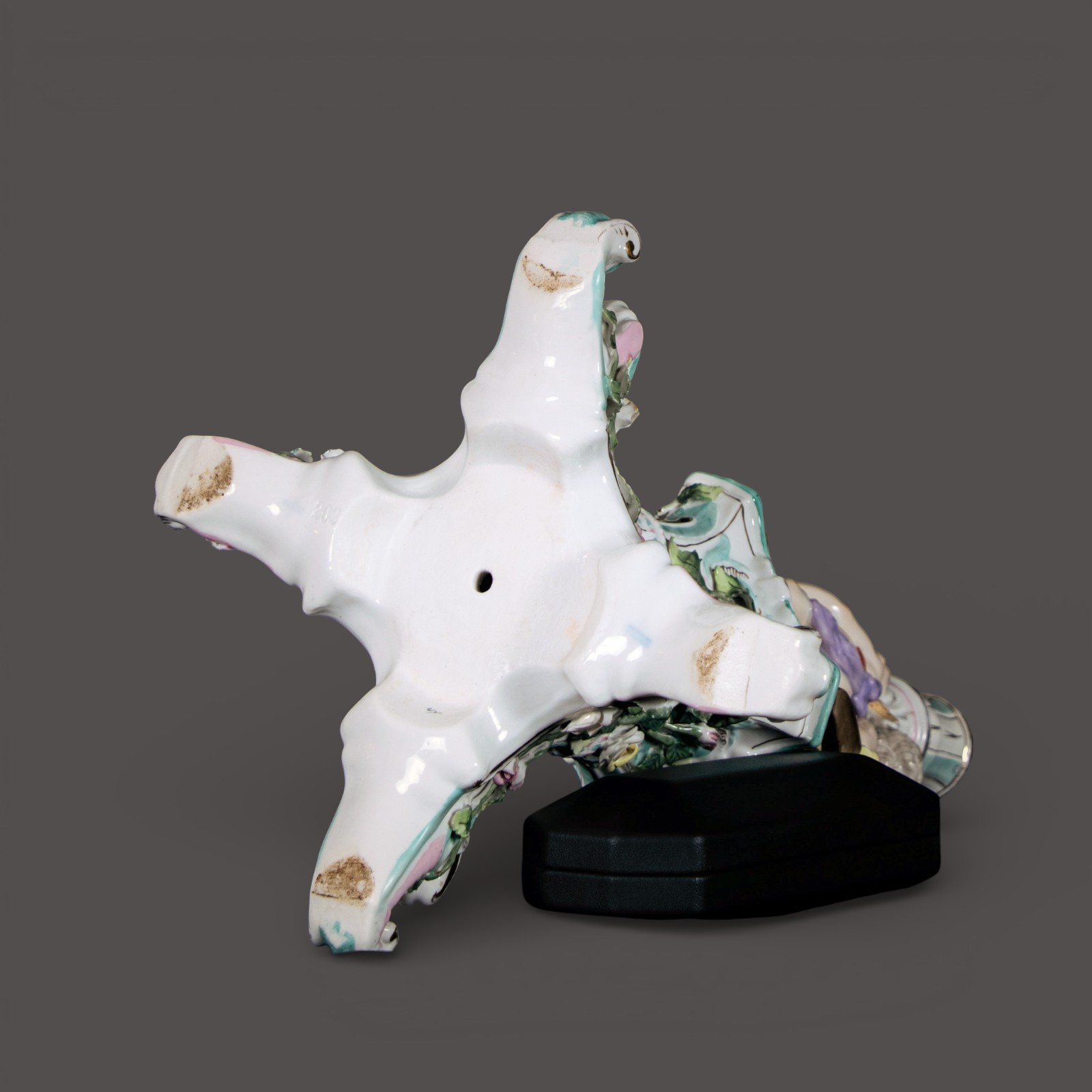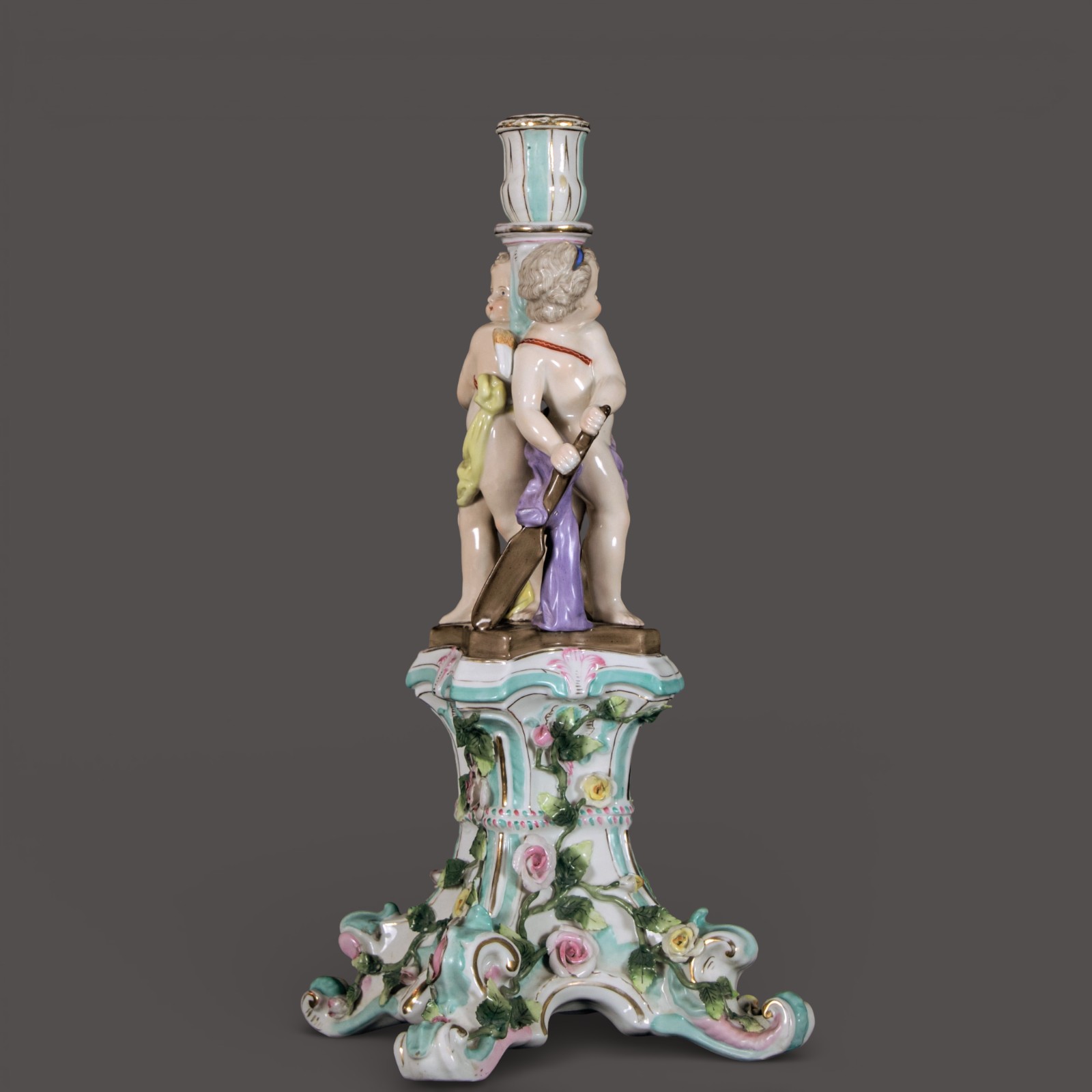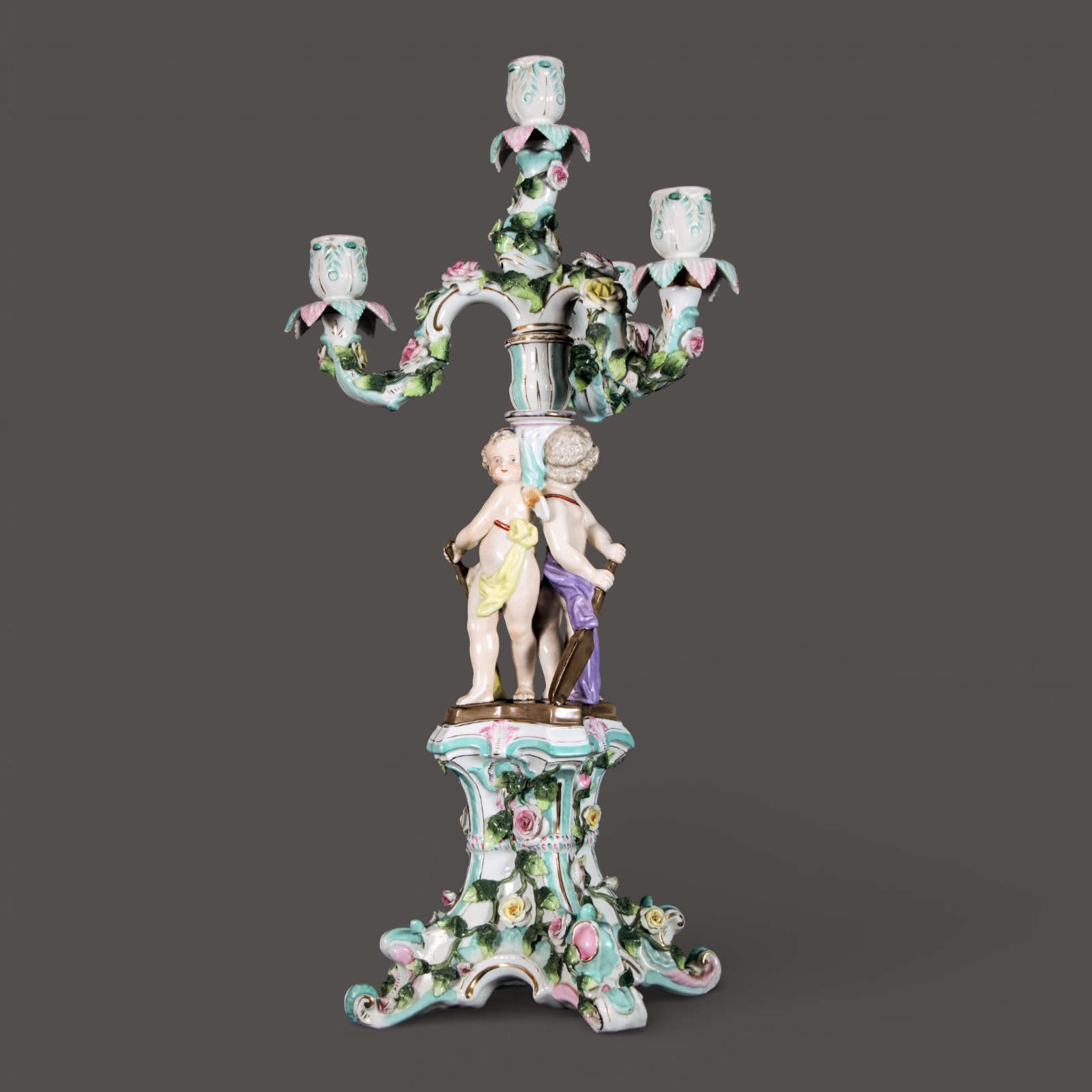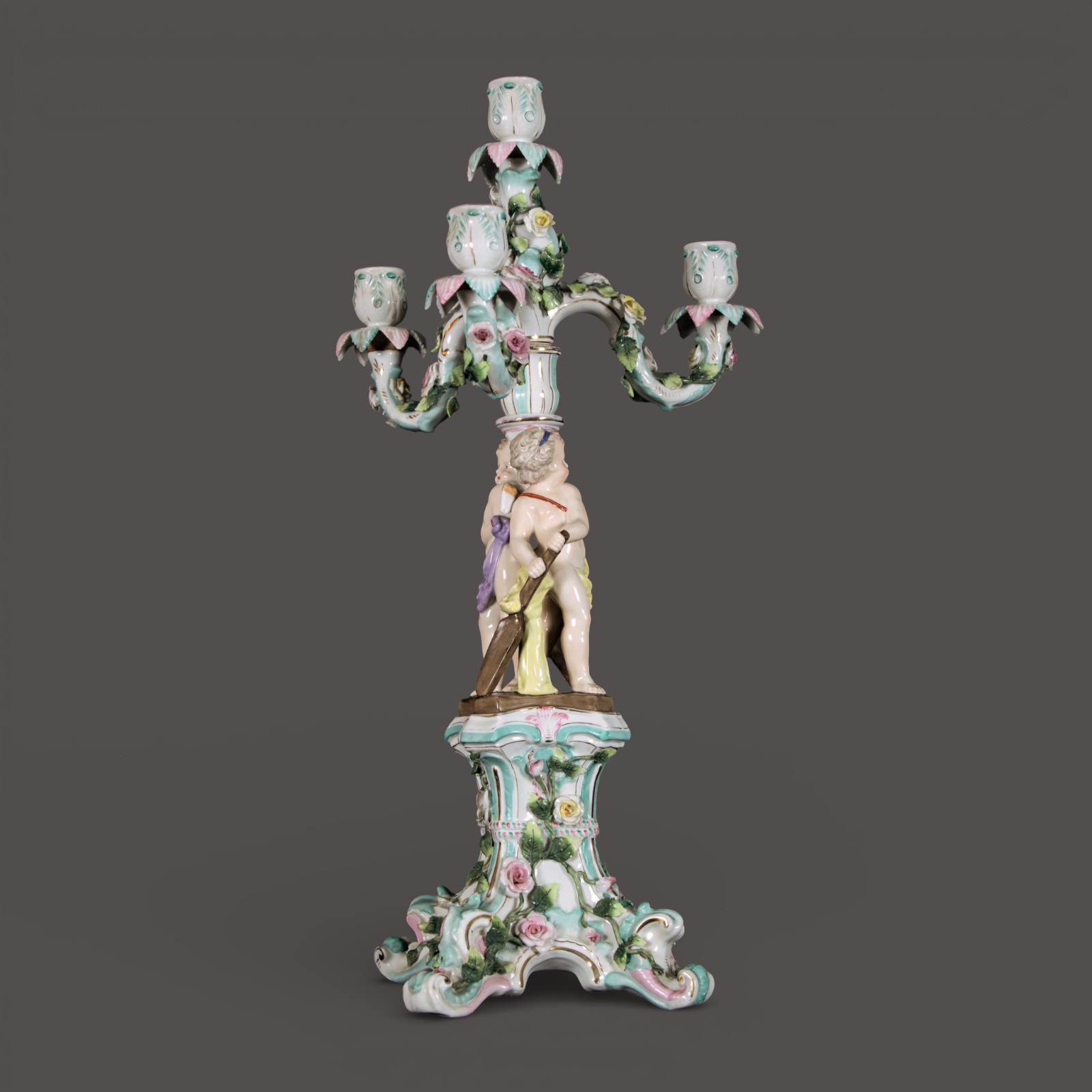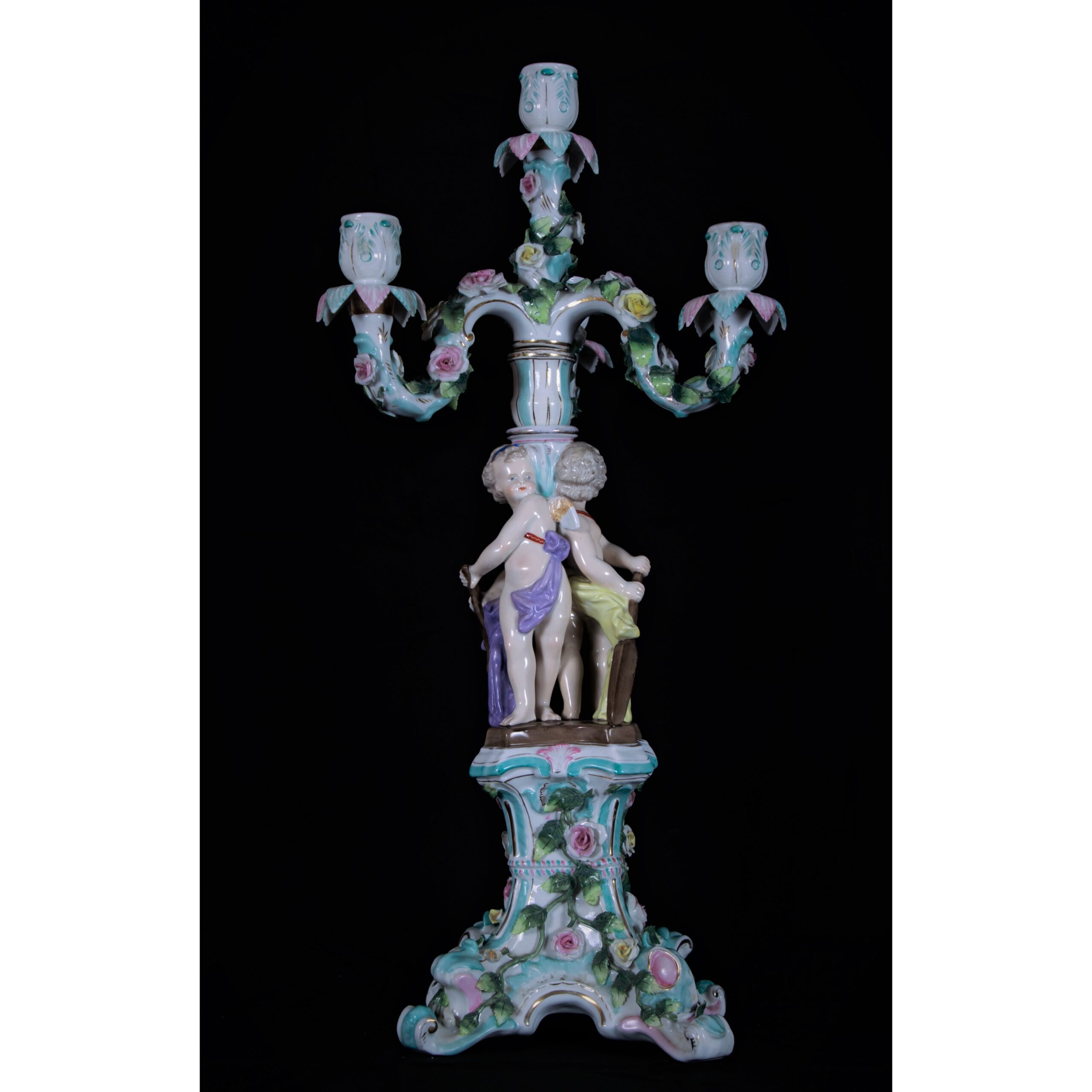 The candle branches are removable, allowing the piece to function either as a multi-light candelabra or as a single figural candlestick, enhancing both its versatility and display options. Elegant, decorative, and technically accomplished, this work stands as a fine example of Sitzendorf’s imaginative figural production and remains highly desirable to collectors of 19th-century European porcelain.