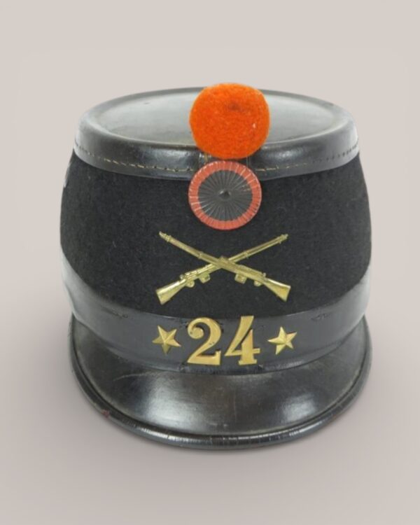The front is mounted with brass crossed rifles, flanked by two stars and the applied number “24,” denoting battalion designation. Above the insignia sits a red and grey cockade surmounted by a vivid red pom-pom, providing a striking contrast to the dark felt body. Ventilation eyelets are present on the sides, and the overall form retains its strong cylindrical profile characteristic of the 1898 pattern.