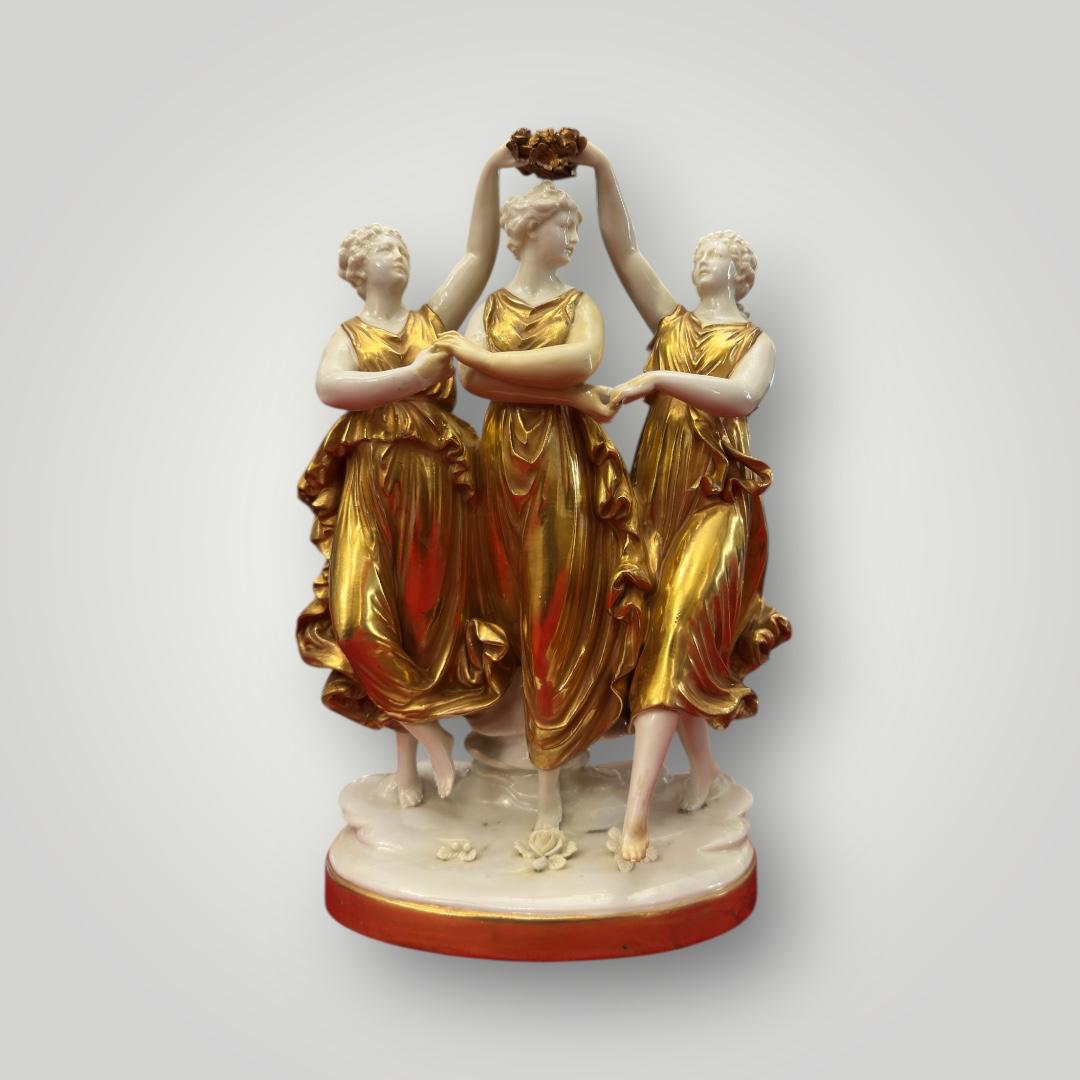 A finely modelled porcelain figural group depicting The Three Graces, emblematic of beauty, charm, and creativity, rendered in the Neoclassical style. The trio stands gracefully entwined, one figure delicately crowning the central muse with a floral garland.