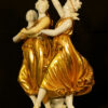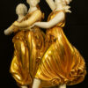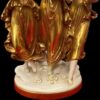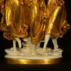 Each figure is exquisitely draped in flowing, gilded robes that shimmer with a rich, lustrous sheen, contrasting beautifully with the soft white porcelain of their skin. The group rests upon an oval base edged with a gilt band and adorned with small applied blossoms, reflecting the refined artistry and romantic elegance characteristic of late 19th-century Dresden porcelain.