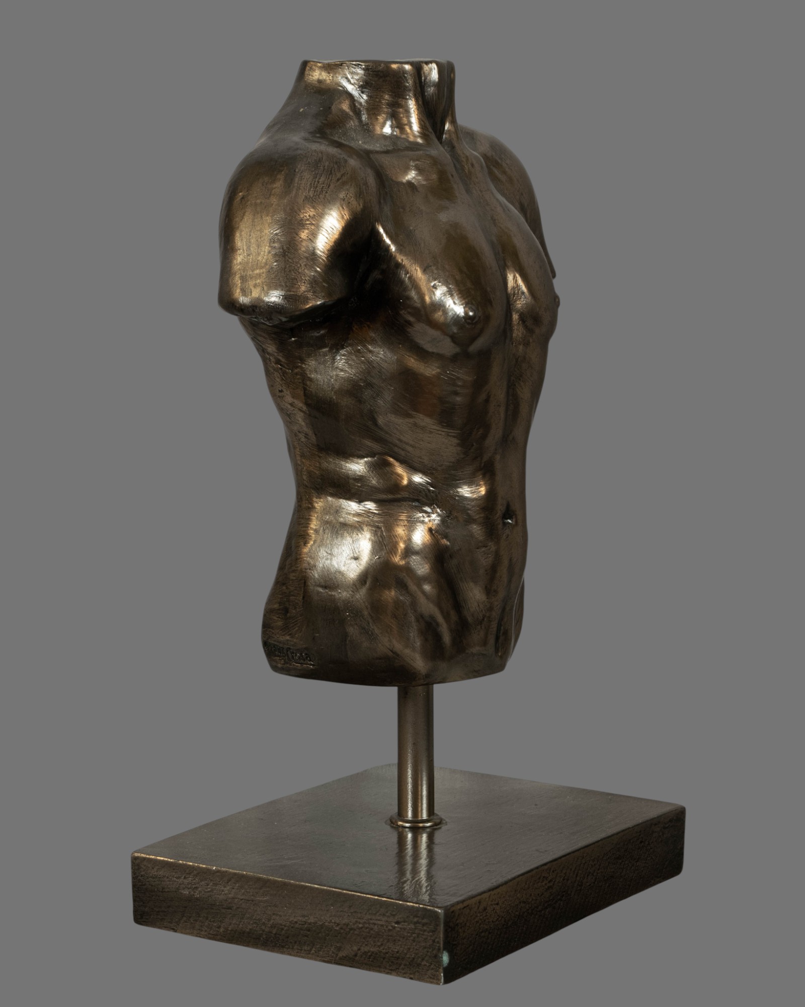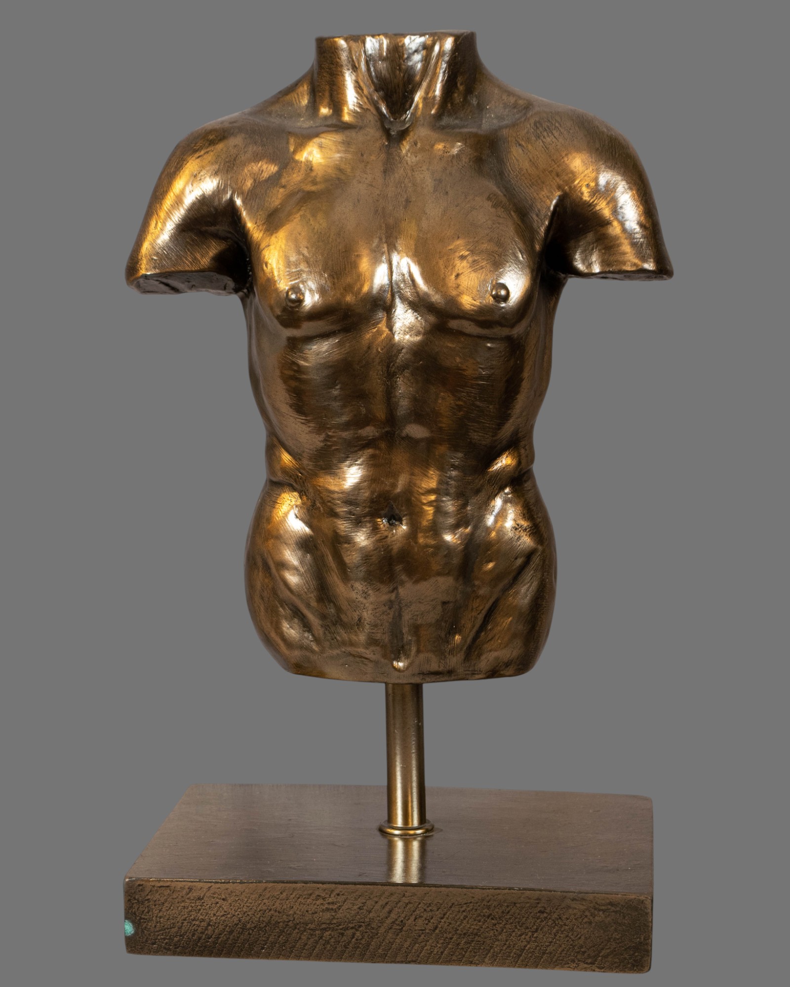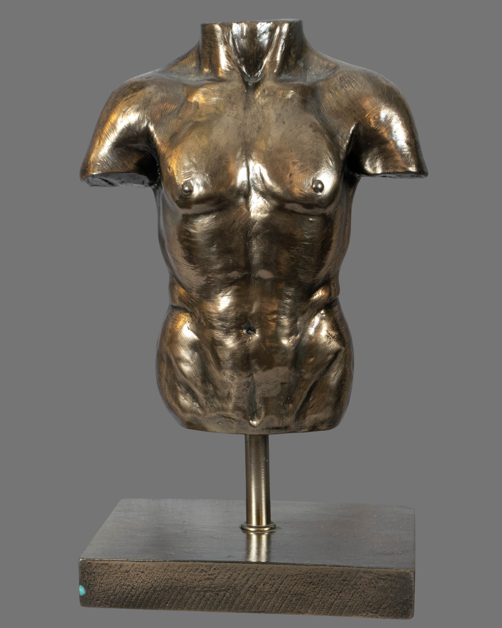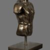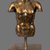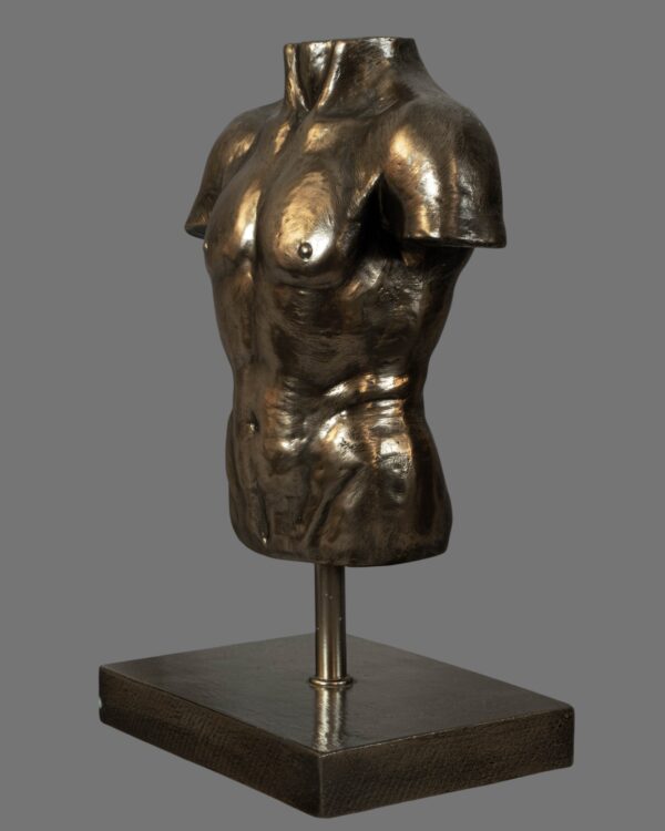 Crafted from a composite material and finished with an antiqued bronze patina, the surface displays subtle tonal variation and textural depth, lending the sculpture a timeless, museum-inspired presence. The bronzed finish enhances the contours of the torso, emphasising the chest, abdomen, and shoulders in a manner reminiscent of classical fragments preserved from antiquity.