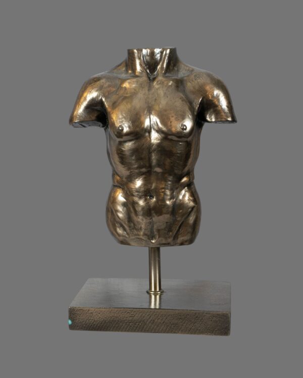 This finely executed antiqued- bronzed classical male torso is a striking sculptural study inspired by the idealised forms of ancient Greek and Roman sculpture. Celebrating balance, strength, and anatomical harmony, the piece captures the classical male figure with carefully modelled musculature and a strong sense of proportion.