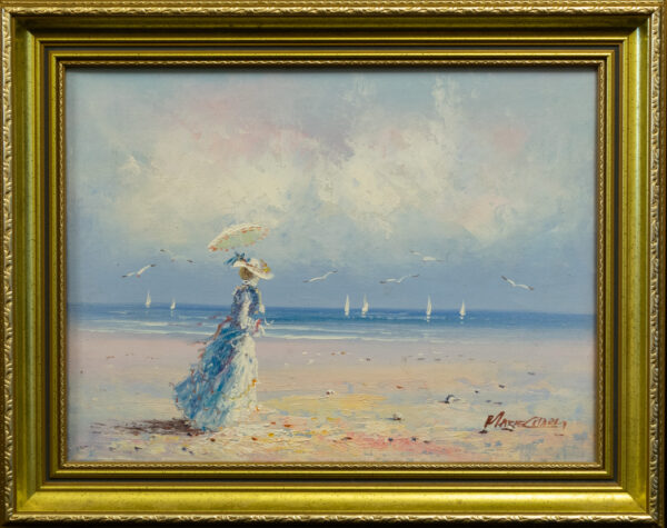 Bathed in the soft, luminous haze of a seaside afternoon, Marie Charlot’s Woman on the Shore captures a fleeting moment of grace and tranquillity. Rendered in rich, textured oil on canvas, this Impressionist masterpiece invites the viewer into a world where light dances across sand and sea, and time slows beneath the gentle sway of a parasol.