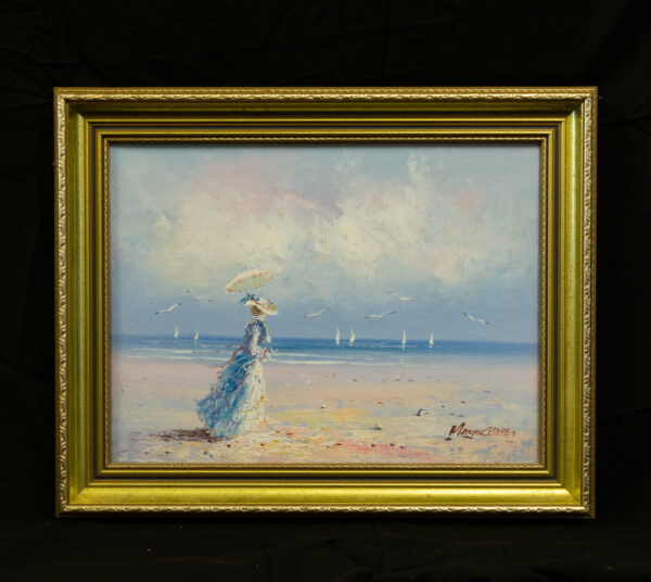 Signed “Marie Charlot” in the lower right corner, this work is more than a portrait; it is a sensory poem, a celebration of solitude, elegance, and the ephemeral beauty of nature. Framed in ornate gold leaf, it radiates timeless charm, ready to grace a refined interior with its serene coastal spirit