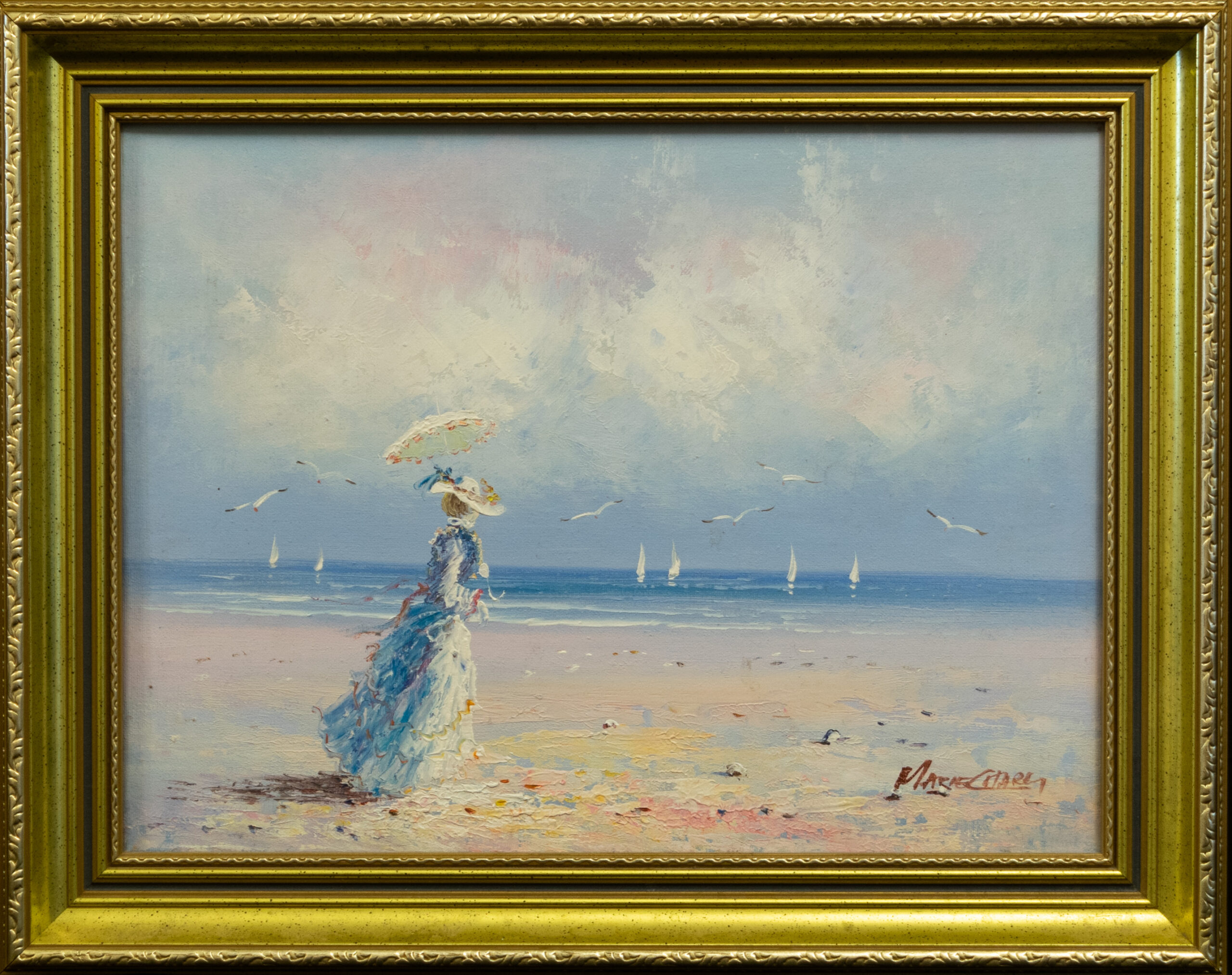 Signed “Marie Charlot” in the lower right corner, this work is more than a portrait; it is a sensory poem, a celebration of solitude, elegance, and the ephemeral beauty of nature. Framed in ornate gold leaf, it radiates timeless charm, ready to grace a refined interior with its serene coastal spirit