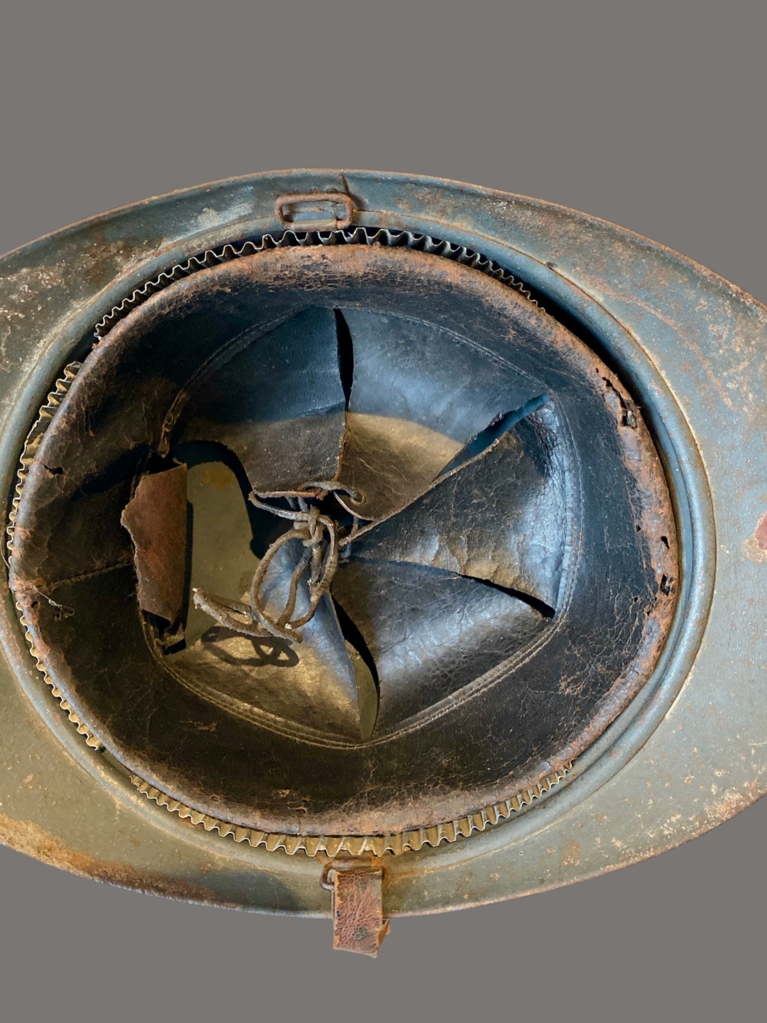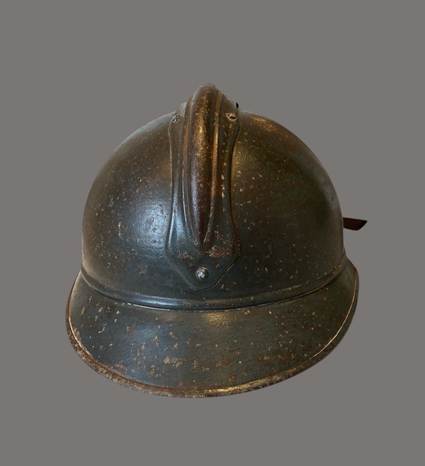 The helmet retains a pleasing aged patina consistent with its age and service use. Signs of wear, surface marks, and oxidation are present, as expected for a genuine WWI example, contributing to its authentic character. The chinstrap remains present, though worn, as shown.