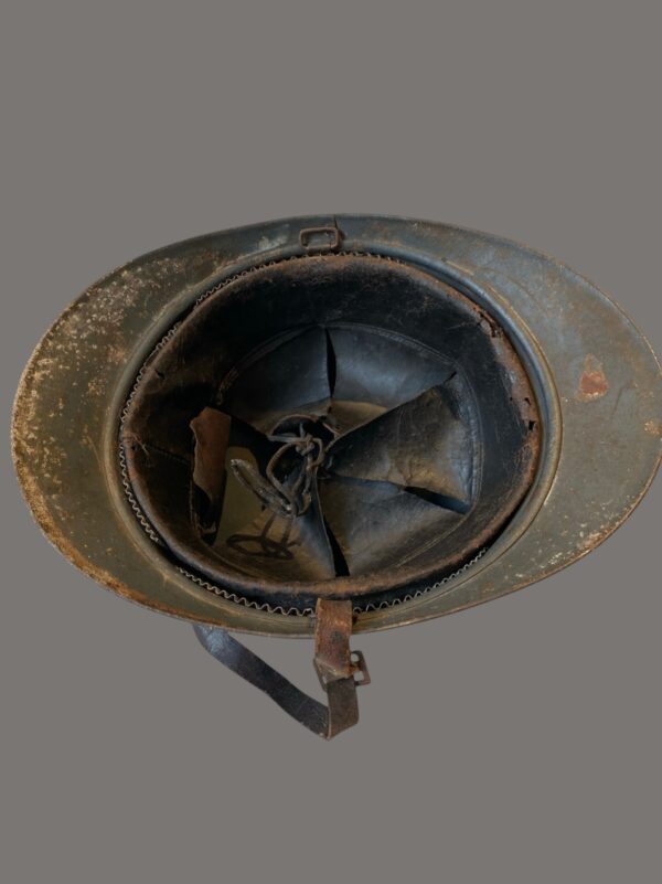 An original World War I French M1915 Adrian pattern steel helmet, complete with the distinctive “RF” (République Française) engineers’ badge to the front. This iconic helmet, designed by Intendant-General Louis Auguste Adrian, became standard issue for French troops during the First World War, offering improved protection in trench warfare conditions.