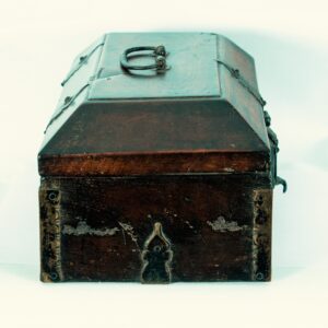 - Antique Teakwood Box with brass and part iron hinges 19th C. Rare exceptional wooden box from South India. The top is carved out of one piece of wood as is the base, without a joint, only the partition at the bottom is added on. The small partion added on is original and in excellent condition for its age with a…